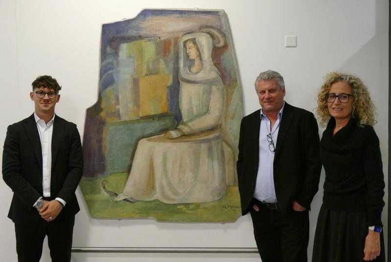Didascalia foto (da sin.): Alain Artioli (Presidente CdA Artisa Group), Roberto Brignoni (Capodicastero sanità e casa anziani Comune di Massagno) e Katja Bigger (Ufficio cantonale dei Beni Culturali) davanti all’opera citata.
